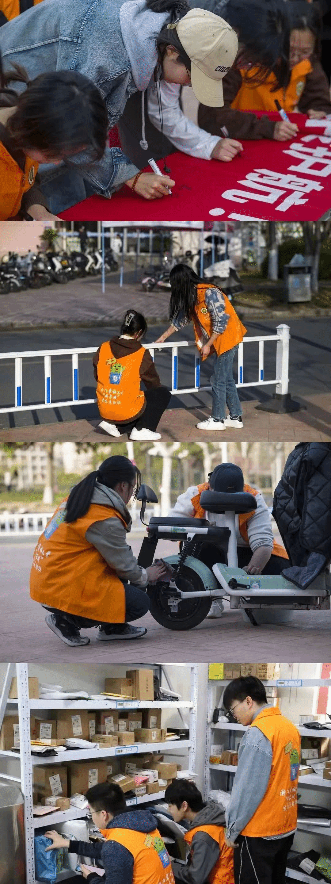 此次活动组织志愿者们以“盲盒”的形式将志愿服务随机分配,共设置有擦拭眼镜、摆放车辆、擦栏杆、擦车、帮取快递等不同的志愿服务形式。活动井然有序地开始,志愿者们整齐划一,身穿橙色的“新长城”志愿者服前往各自的工作岗位,为东湖食堂一角增添了鲜艳的色彩。他们将食堂外的车辆摆放整齐,将栏杆擦拭干净。同时也为有需要的同学擦拭眼镜、擦拭电动车,收集同学们的快递信息,去往驿站将快递送至他们所在的宿舍,参与师生也纷纷在活动纪念条幅上留下了自己的签名与祝福。