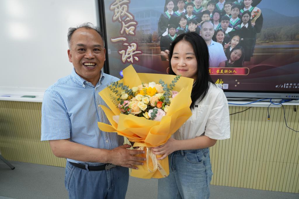 在黄老师说出“下课“后,班长富有仪式感的喊“起立!”,全班同学集体起身鞠躬致谢。随后,同学们为黄老师献花拍照留念。