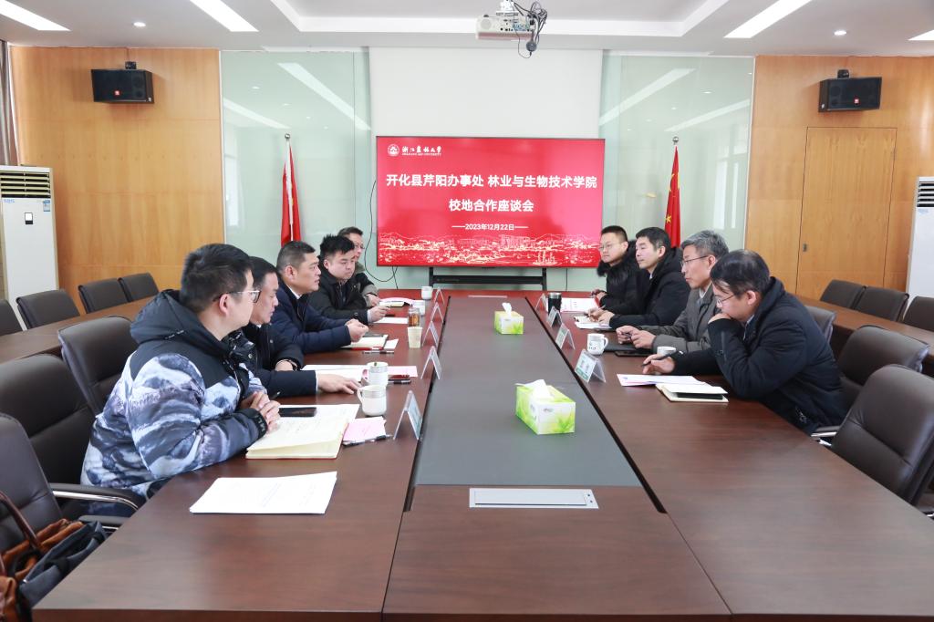 12月22日,开化县芹阳办事处党工委书记郑凯一行到林生院对接校地合作相关事宜,学院党委书记郑炳松,副院长陈健、郭恺,党委副书记潘军可参加座谈会。