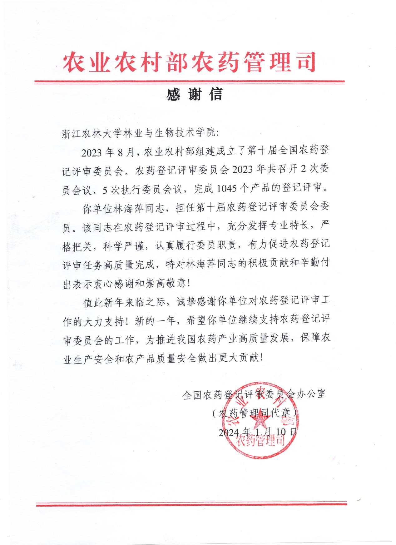 近日,学院收到农业农村部农药管理司发来的感谢信,对于学院林海萍教授在担任第十届农药登记评审委员会委员期间,对国家农药登记评审工作的大力支持表示诚挚的感谢。